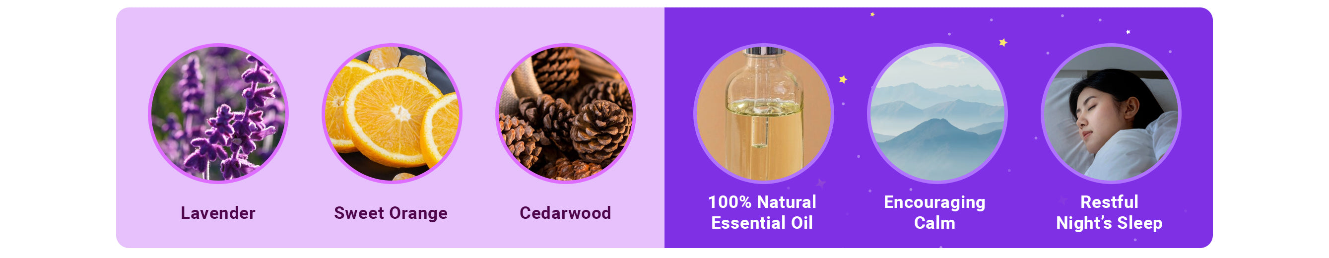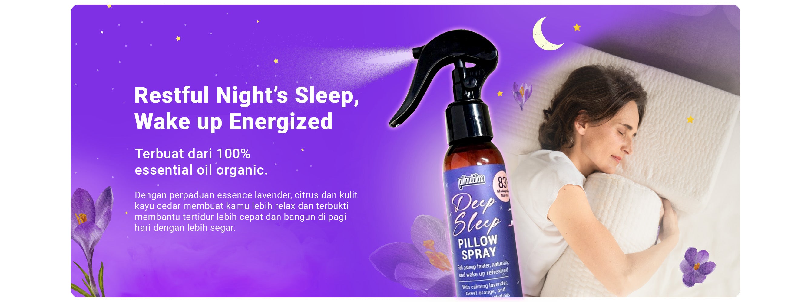 Terbuat dari 100% essential oil organic. Dengan perpaduan essence lavender, citrus dan kulit kayu cedar membuat kamu lebih relax dan terbukti membantu tertidur lebih cepat dan bangun di pagi hari dengan lebih segar.