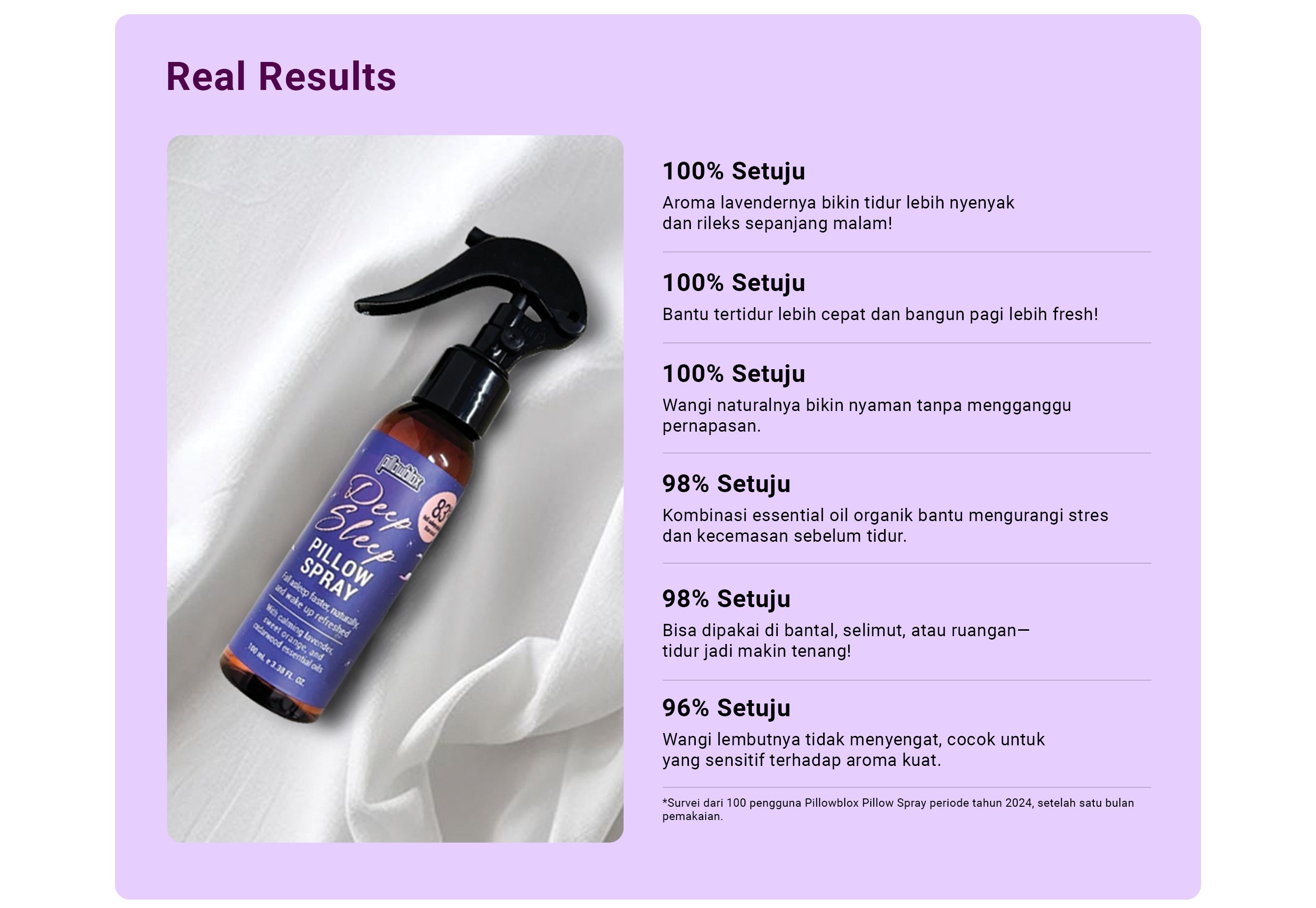š¤ Semprotkan 5 menit sebelum tidur pada sarung bantal, selimut atau ruangan.