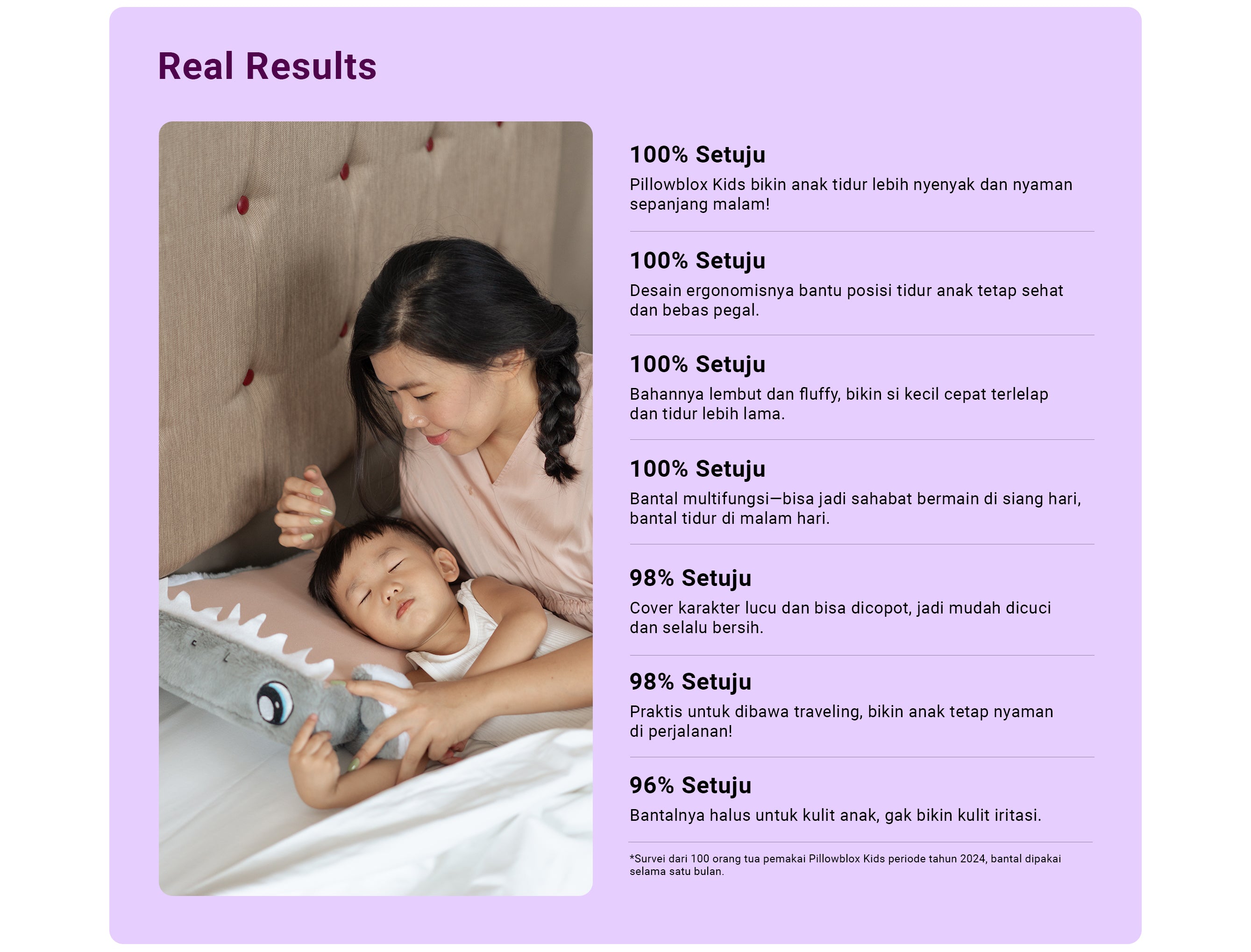 Ever wonder gimana caranya buat anak tidur nyenyak sekaligus sehat? Nah, dengan design playful, Pillowblox Kids bukan hanya soal bentuk yang lucu. Struktur bentuk dan foamnya mengajak anak untuk tidur menyamping, posisi yang terbukti baik untuk kesehatan mereka. Core bantal dari viscoelastic foam memastikan tidur mereka dalam dan berkualitas. So, bukan hanya cepat terlelap, tapi mimpi indahnya pun makin lama.