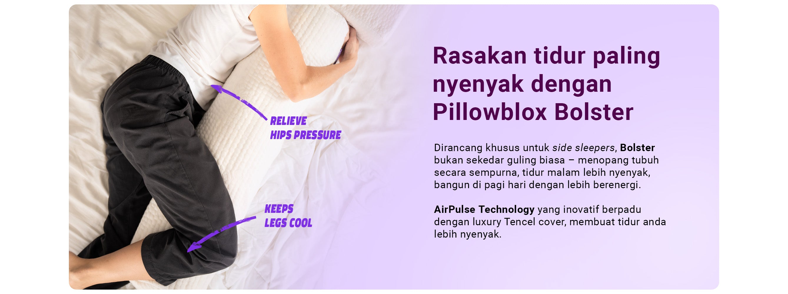 ๐๏ธ Rasakan tidur paling nyenyak dengan Pillowblox Bolster, di mana AirPulse Technology yang inovatif berpadu dengan luxury Tencel cover. Dirancang khusus untuk side sleepers, Pillowblox bukan sekedar guling biasa โ menopang tubuh secara sempurna untuk tidur malam lebih nyenyak, bangun di pagi hari dengan lebih berenergi.