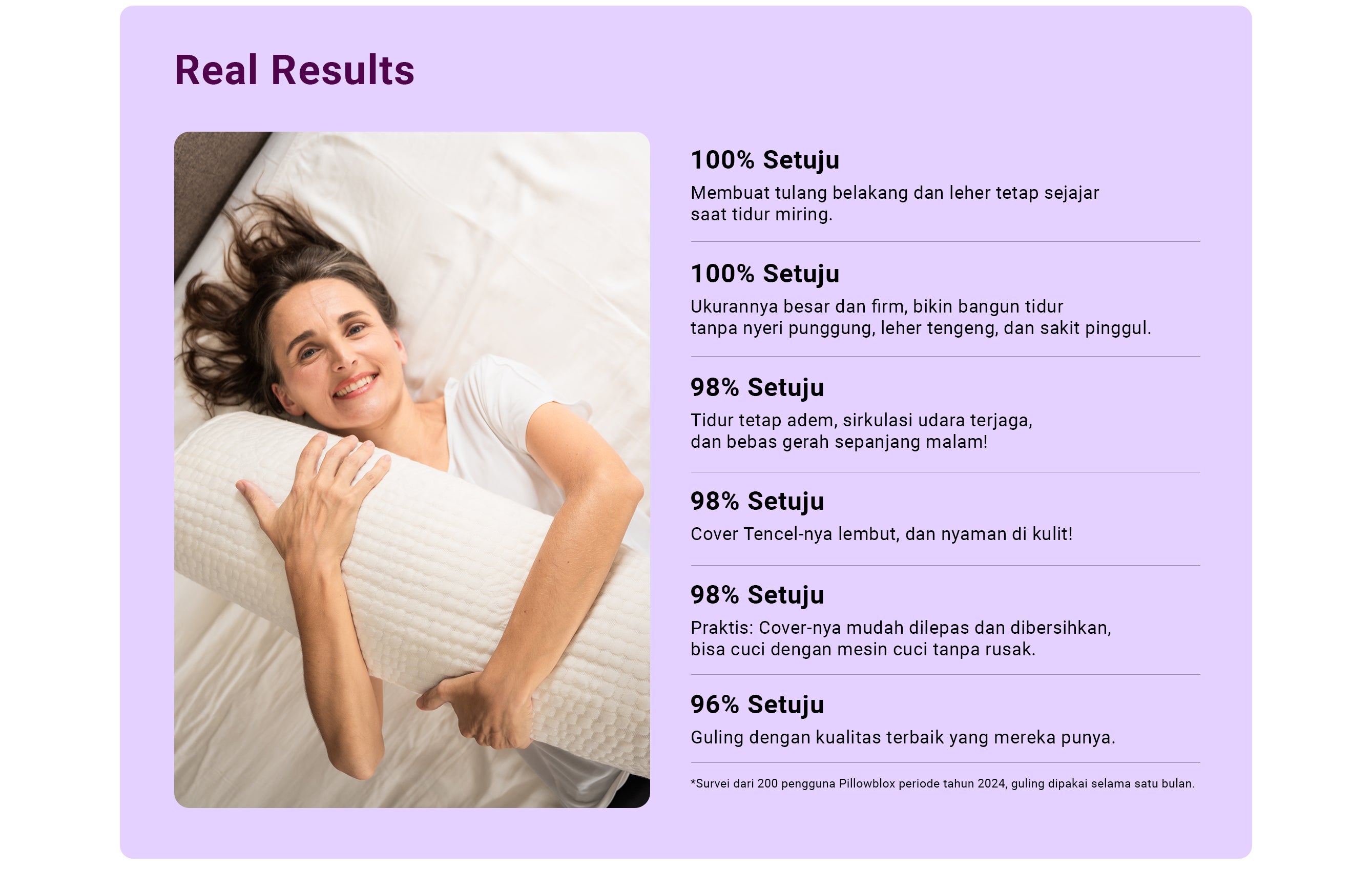 - Perfect Density for Side Sleepers: Setelah riset selama bertahun-tahun, kami menemukan density yang sempurna agar side sleepers bisa tetap nyaman dan memberikan support yang ideal, mengurangi tekanan pada bahu dan pinggul.